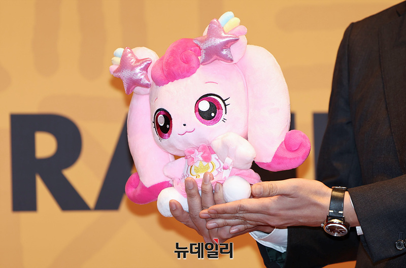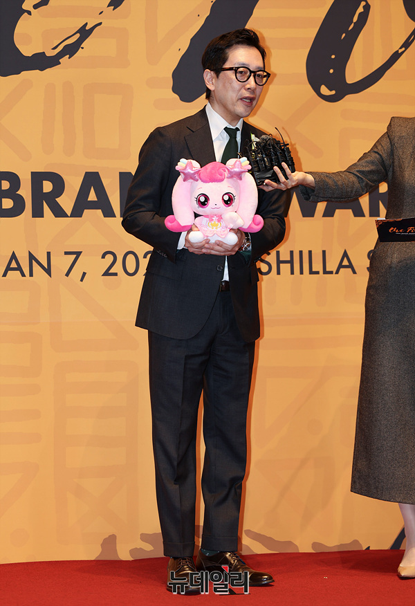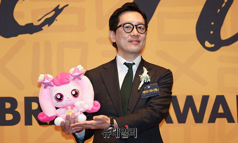 '캐치 티니핑' 최재원 부대표가 7일 오전 서울 중구 신라호텔에서 열린 '2025 대한민국 퍼스트브랜드 대상 시상식' 포토월에서 티니핑 캐릭터 '하츄핑' 인형을 들고 포즈를 취하고 있다.