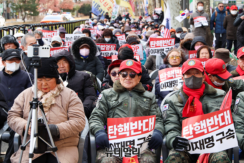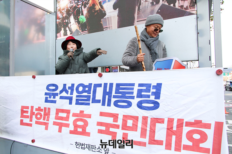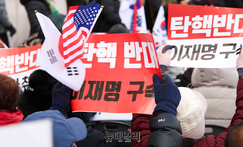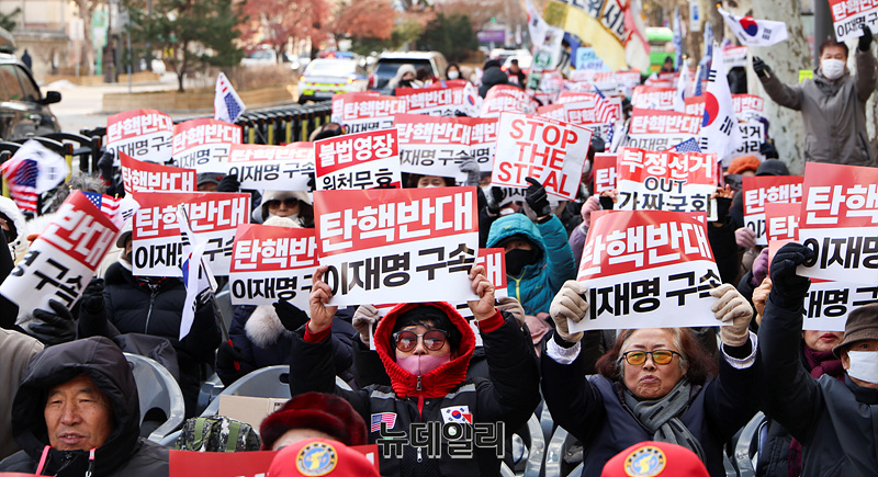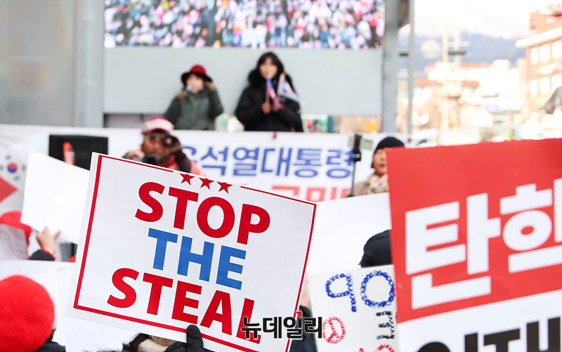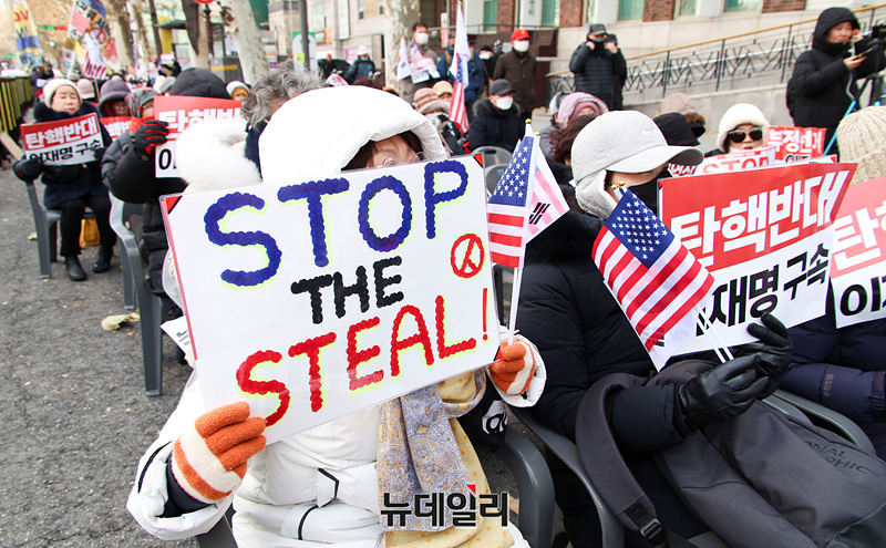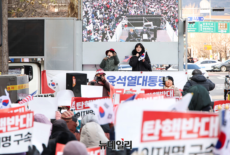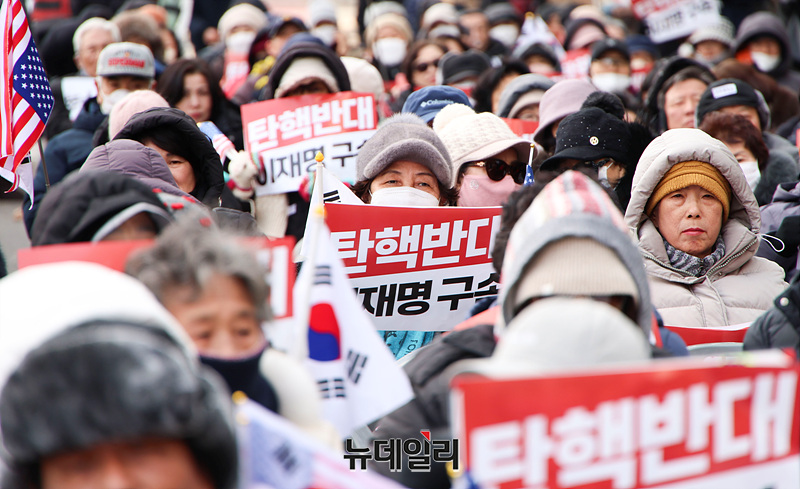 윤석열 대통령 체포영장 유효기간이 만료된 7일 오후 서울 중구 헌법재판소 인근에서 윤 대통령을 지지하는 시민들이 탄핵무효를 주장하며 집회를 하고 있다.