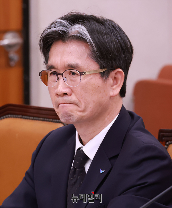 오동운 고위공직자범죄수사처장이 7일 오후 국회에서 열린 법제사법위원회 전체회의에 출석해 굳은 얼굴로 앉아 있다.