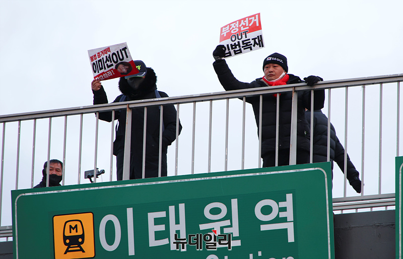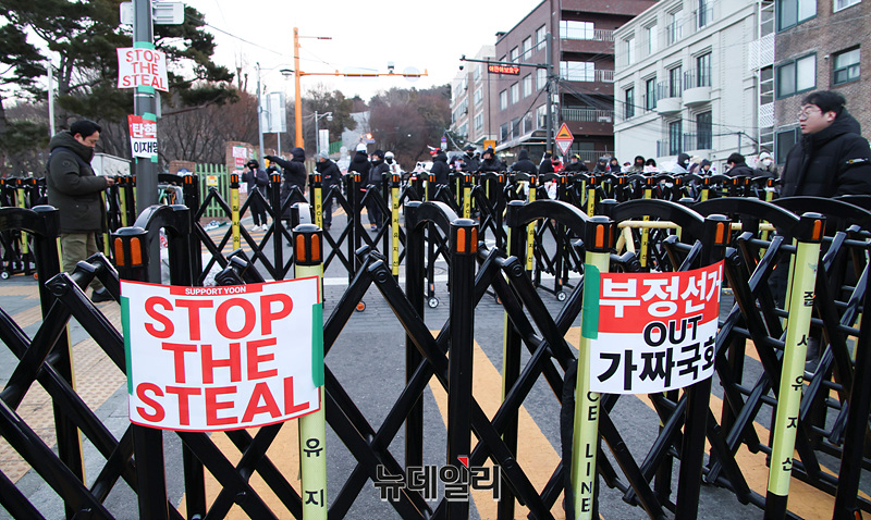 법원이 윤석열 대통령에 대한 체포영장을 재발부한 가운데 8일 오전 서울 용산구 한남동 관저 앞에 지지자들이 집결해 있다.