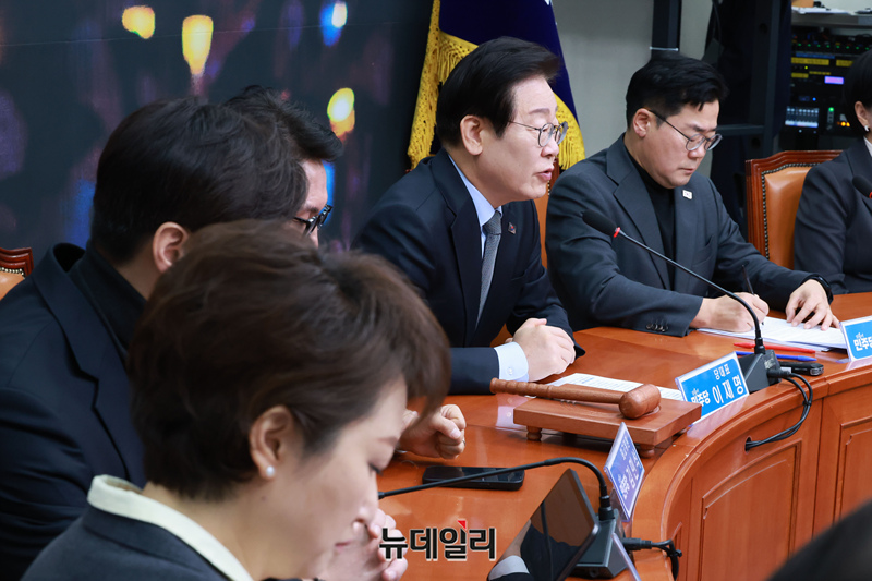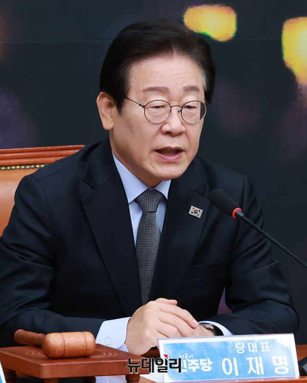 이재명 더불어민주당 대표가 8일 오전 국회에서 열린 최고위원회의에 참석해 모두발언을 하고 있다.
