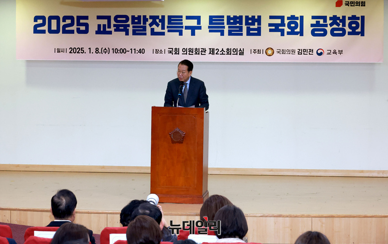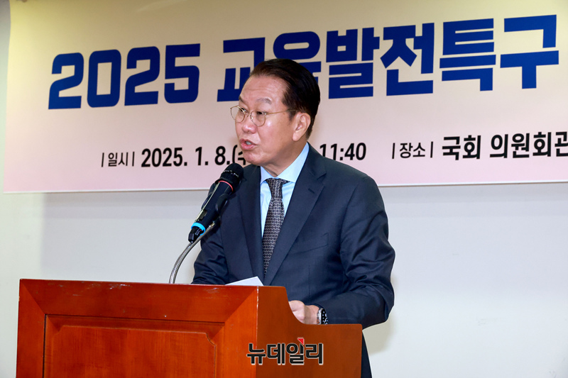 권영세 국민의힘 비대위원장이 8일 오전 국회 의원회관에서 열린 '2025 교육발전특구 특별법 국회 공청회'에 참석해 축사를 하고 있다.