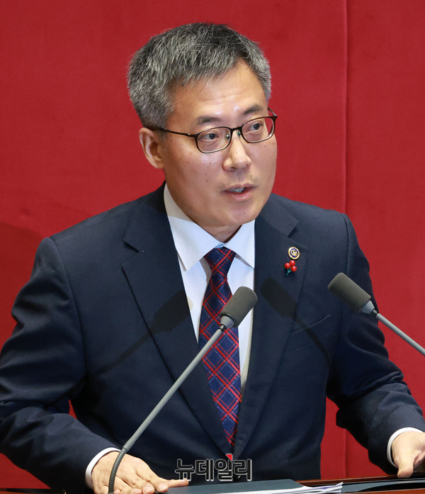 김석우 법무부 장관 직무대행(차관)이 8일 오후 국회에서 열린 본회의에서 내란·김건희 특검법 재의 요구의 건에 대해 설명하고 있다.