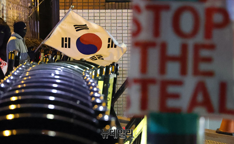 [포토] '윤석열 대통령과 함께 싸우겠습니다' 관저 입구 지키는 시민들