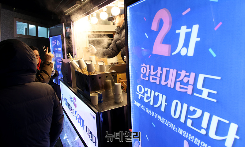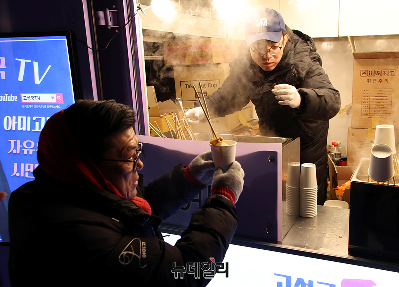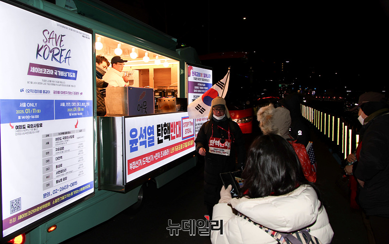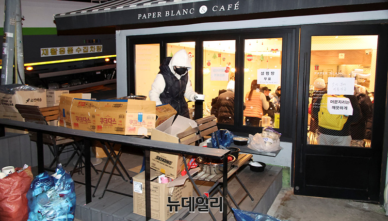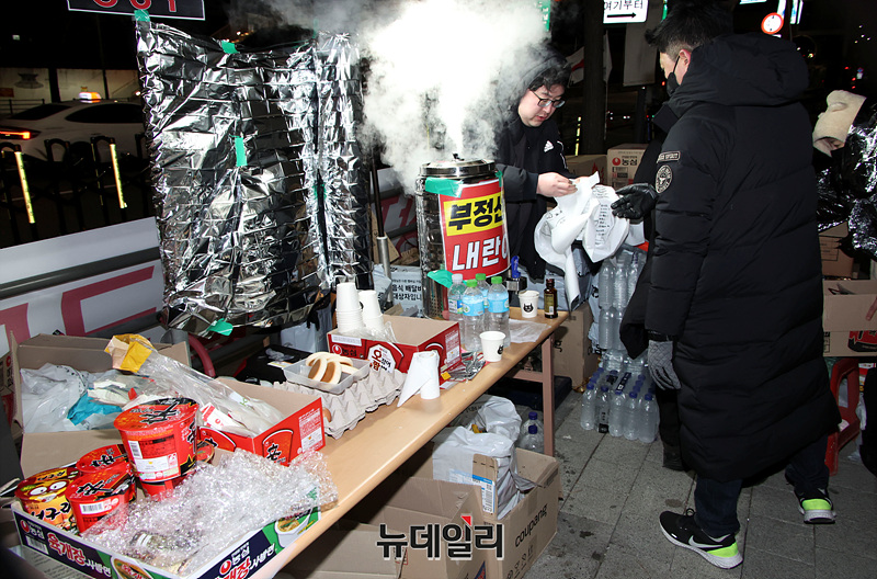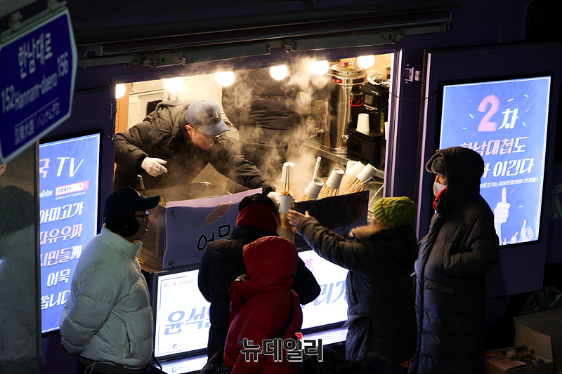 서울 전역에 올겨울 첫 한파주의보가 발효된 가운데 9일 오전 서울 용산구 한남동 대통령 관저 인근에서 윤석열 대통령 지지자들이 쉼터와 푸드트럭 등을 이용하며 추위를 녹이고 있다.