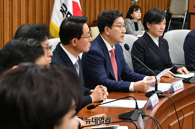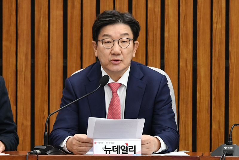 권성동 국민의힘 원내대표가 9일 국회에서 열린 설 성수품 가격안정 및 소비진작을 위한 당정협의회에 참석해 모두발언을 하고 있다.