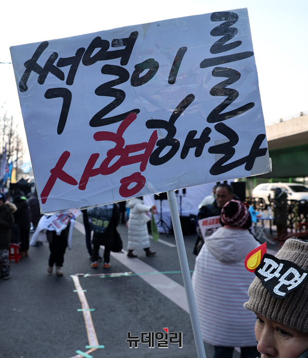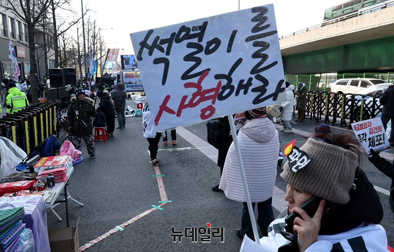 윤석열 대통령 탄핵찬성 지지자가 12일 오전 서울 용산구 한남동 관저 입구에서 사형집행을 촉구하는 피켓을 들고 집회에 참가하고 있다. 같은시각 루터교회 앞에는 주일을 맞아 기독교 전국연합예배가 진행되고 있다. 오후부터 탄핵 반대 집회가 이어질 예정이다.