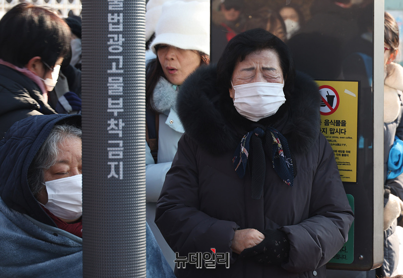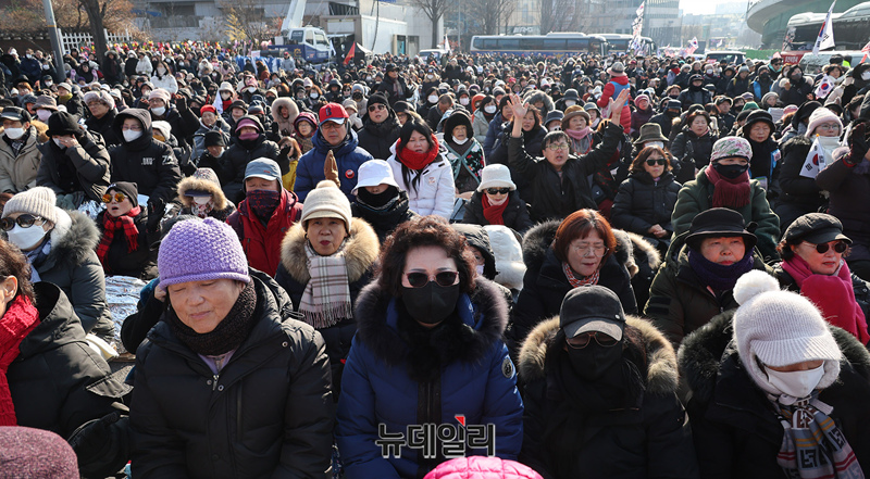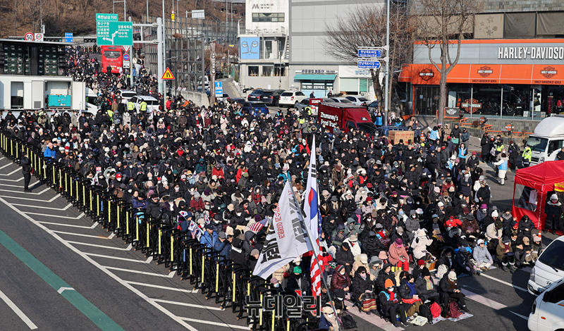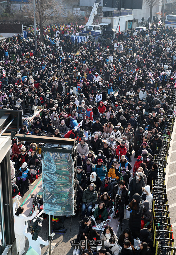 한남동 관저 앞에서 기독교 전국연합예배 열린 12일 오전 예배 참석자들이 대거 운집해 예배를 드리고 있다. 이날 오후부터 윤석열 대통령 탄핵반대 집회가 이어질 예정이다.
