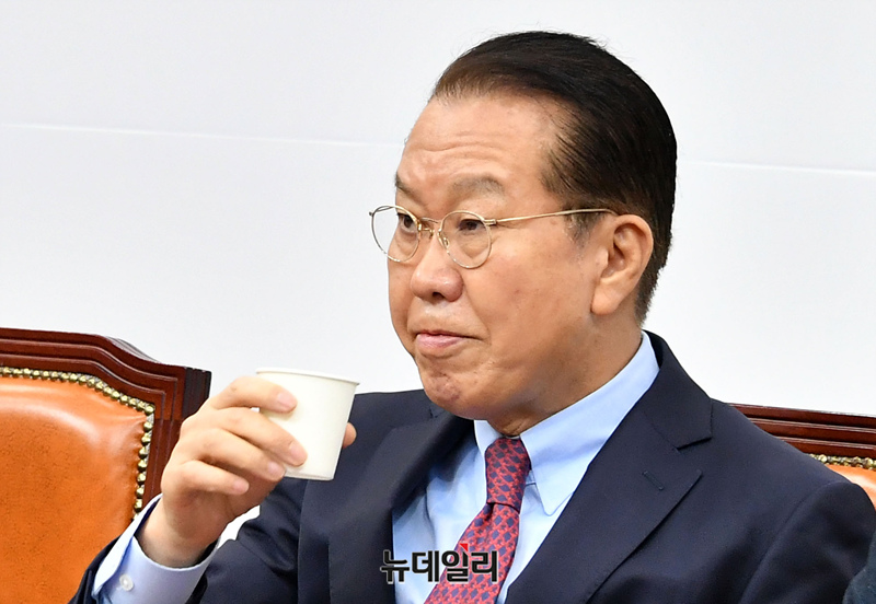 권영세 국민의힘 비상대책위원장이 13일 오전 국회에서 열린 비상대책위원회의에 참석해 물을 마시고 있다.