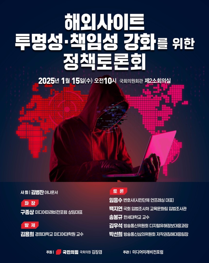 국민의힘 김장겸 의원(국회 과학기술정보방송통신위원회)이 '해외사이트 투명성‧책임성 강화를 위한 정책토론회'를 주최한다. 토론회에서는 나무위키‧누누티비 등 국내 서비스를 통해 막대한 수익을 올리면서도 국내법 규제의 사각지대를 악용해 법적 책임은 회피하는 해외사이트의 실태를 살펴보고, 불법사이트 근절과 해외사이트에 대한 투명성‧책임성 확보 방안들이 논의될 전망이다.