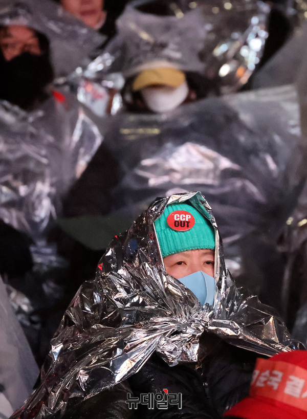[포토] 눈비가 와도 금박은박 덮으며 윤 대통령 사수