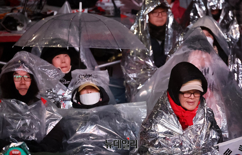 공수처의 윤석열 대통령 체포영장 2차 집행이 입박한 13일 오후 서울 용산구 한남동 관저 앞에서 비와 눈이 오는 가운데 시민들이 탄핵반대 집회를 이어가고 있다.