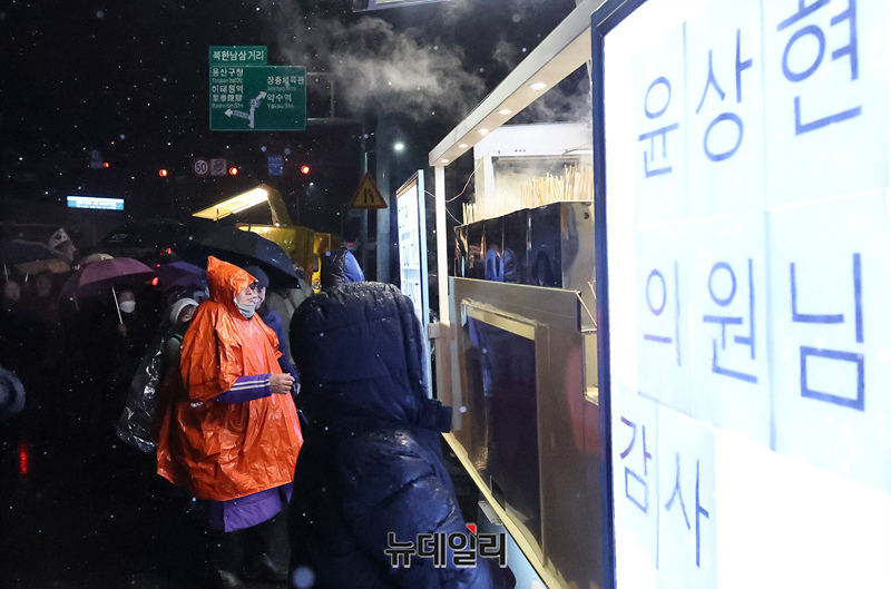 공수처의 윤석열 대통령 체포영장 2차 집행이 입박한 13일 오후 서울 용산구 한남동 관저 앞에서 탄핵반대 집회에 참석한 시민들이 음식과 음료를 무료로 나눠주는 푸드트럭을 이용하고 있다.