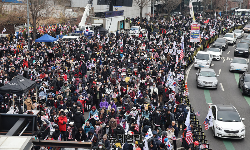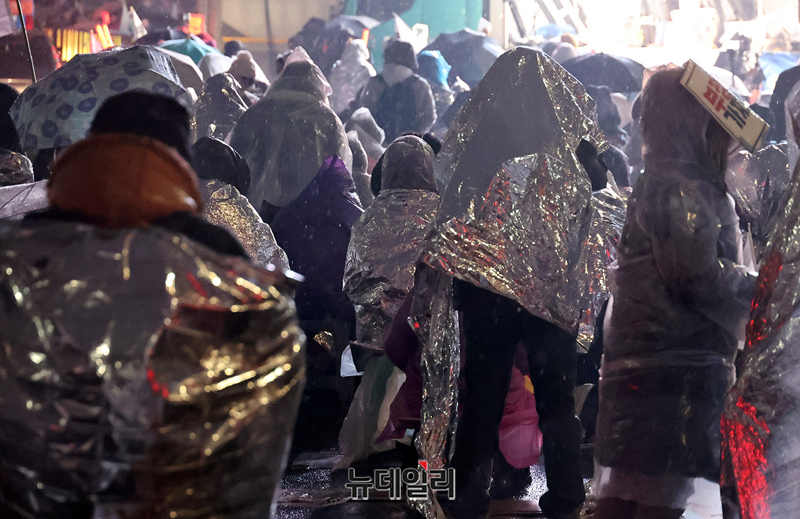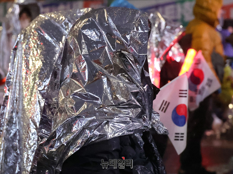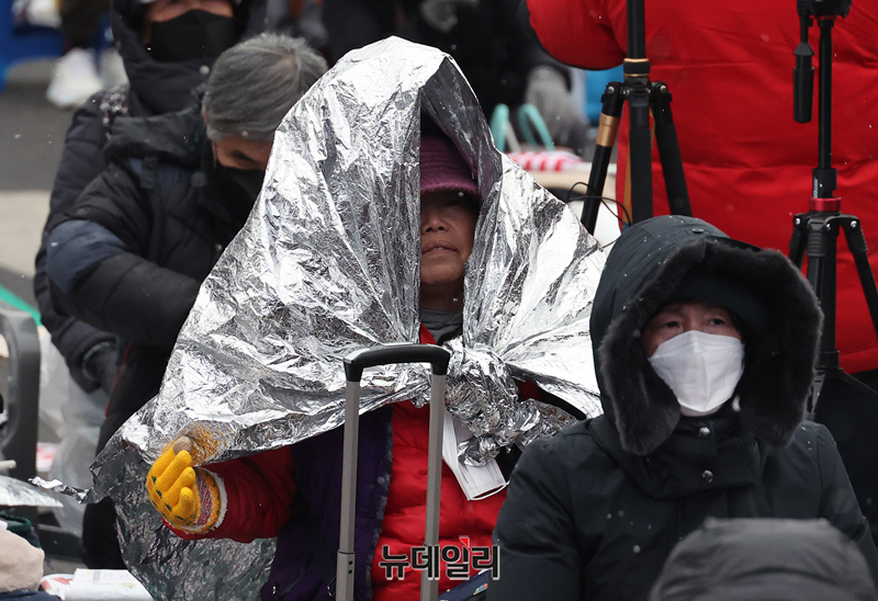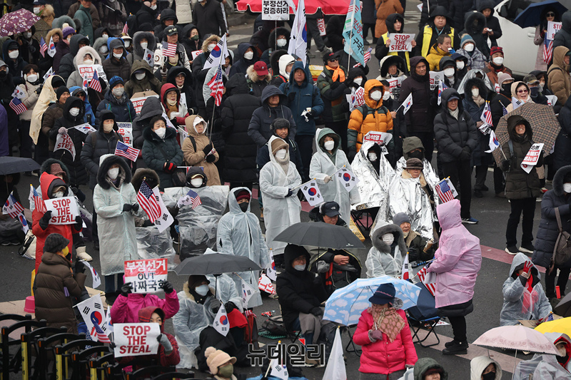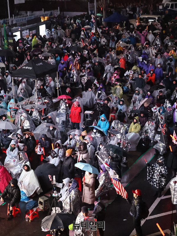 공수처의 윤석열 대통령 체포영장 2차 집행이 임박한 13일 오후 서울 용산구 한남동 관저 앞에서 비와 눈이 오는 가운데 시민들이 탄핵반대 집회를 이어가고 있다.
