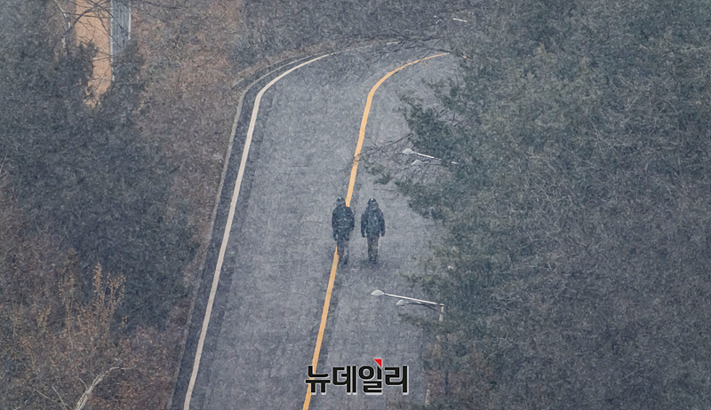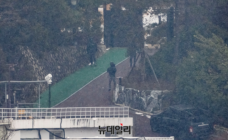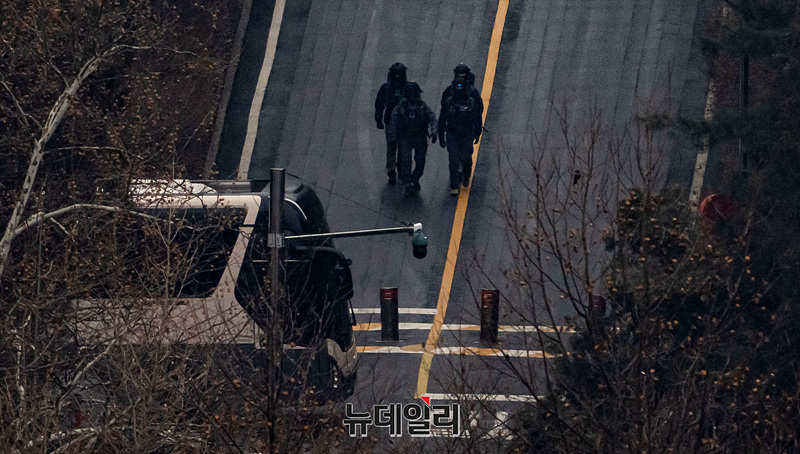 윤석열 대통령에 대한 2차 체포영장 집행을 앞둔 13일 오후 서울 용산구 한남동 대통령 관저에 대통령 경호처 요원들이 이동하고 있다.