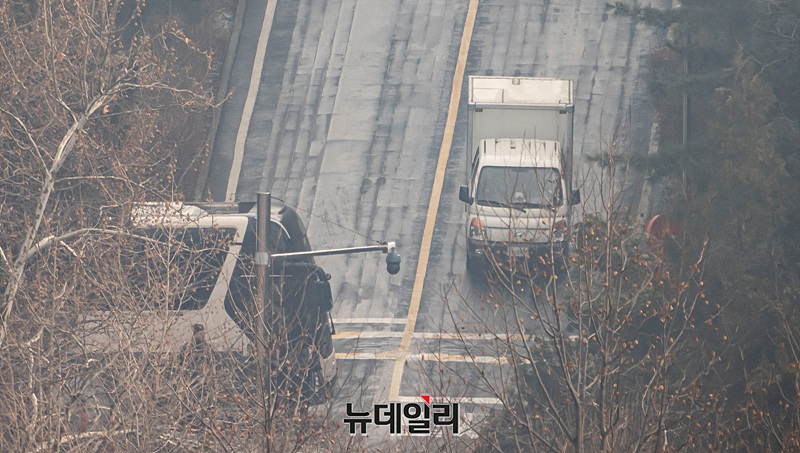 윤석열 대통령에 대한 2차 체포영장 집행을 앞둔 14일 오전 서울 용산구 한남동 관저 밖으로 트럭이 이동하고 있다.