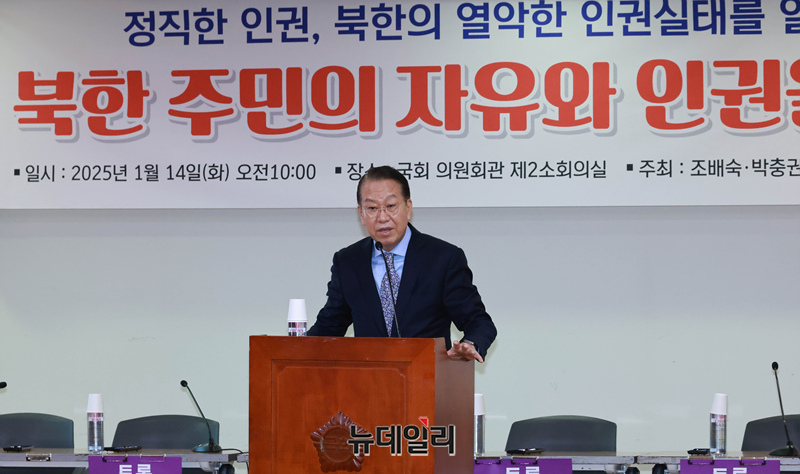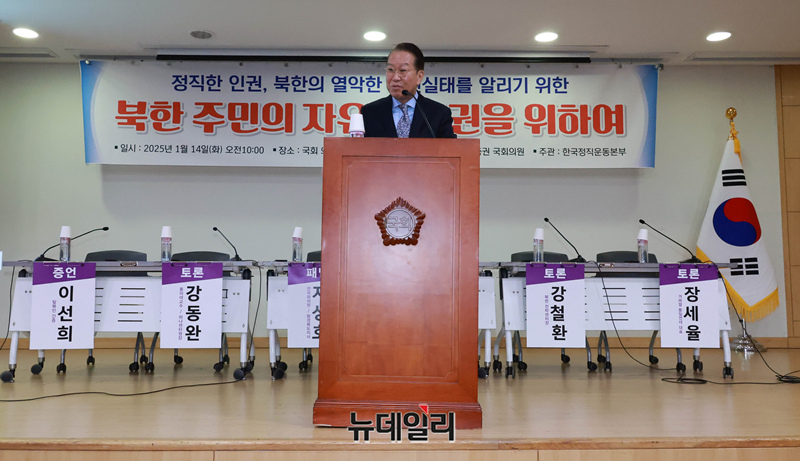 권영세 국민의힘 비상대책위원장이 14일 오전 국회 의원회관에서 열린 '정직한 인권, 북한의 열악한 인권실태를 알리기 위한 북한인권 국회포럼'에서 축사를 하고 있다.