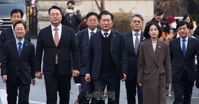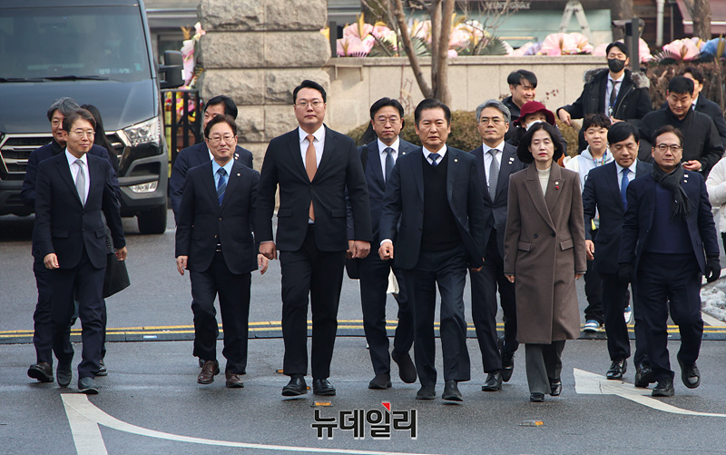 윤석열 대통령의 탄핵심판 첫 변론기일인 14일 오후 정청래 단장을 비롯한 탄핵소추단이 서울 종로구 헌법재판소에 출석하고 있다.