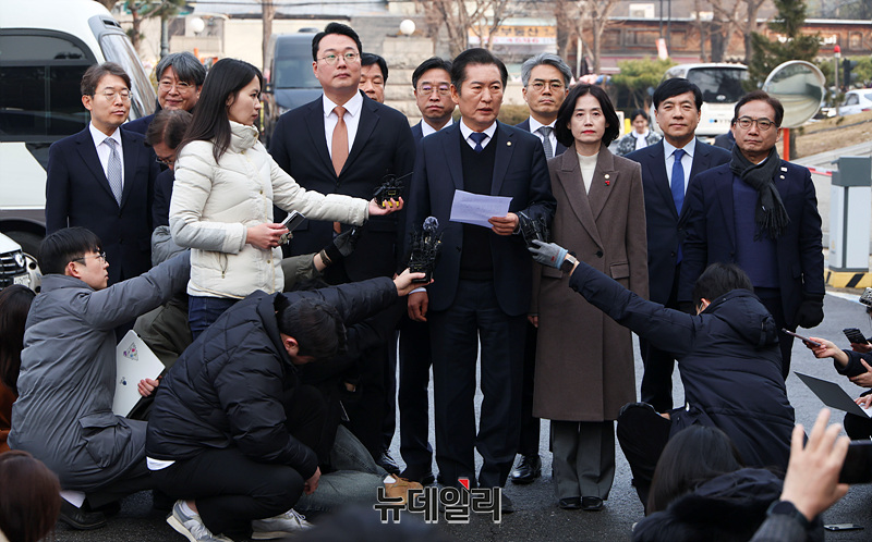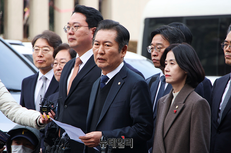 정청래 탄핵소추단장이 14일 오후 서울 종로구 헌법재판소에서 열린 윤석열 대통령 탄핵심판 첫 변론기일에 출석하며 발언하고 있다.