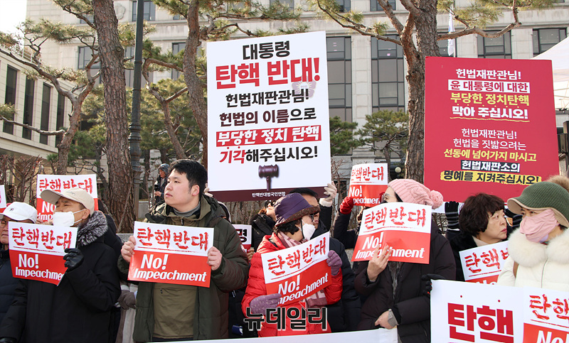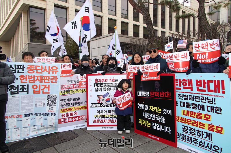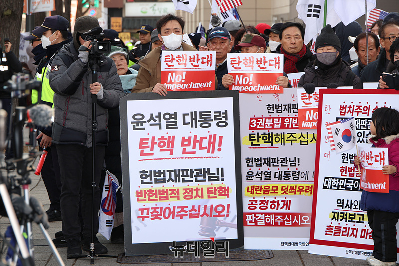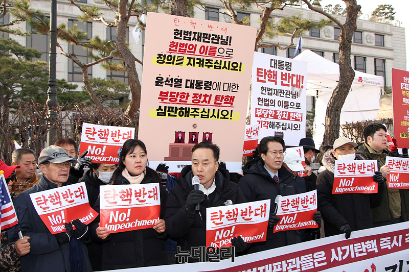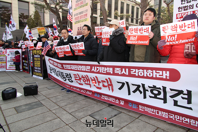 윤석열 대통령의 탄핵심판 첫 변론기일인 14일 오후 탄핵반대범국민연합이 서울 종로구 헌법재판소 앞에서 윤석열 대통령 탄핵 반대 기자회견을 진행하고 있다.