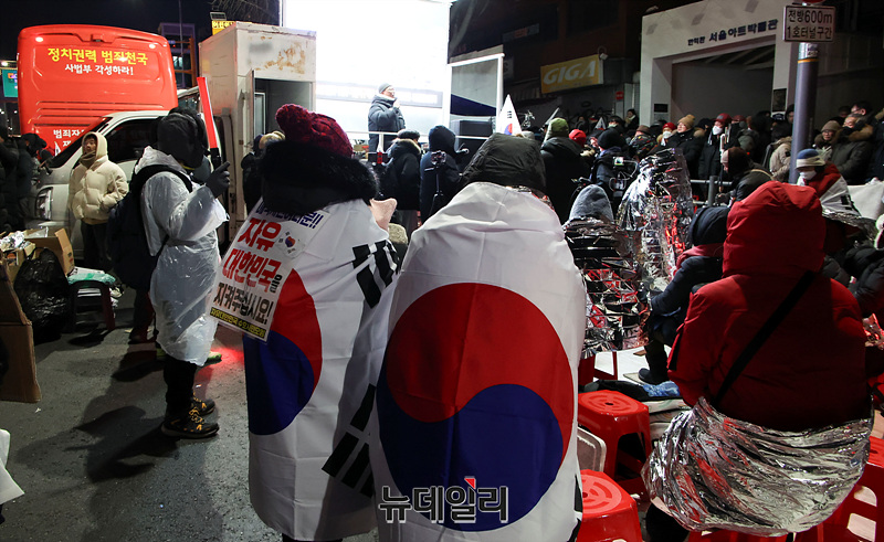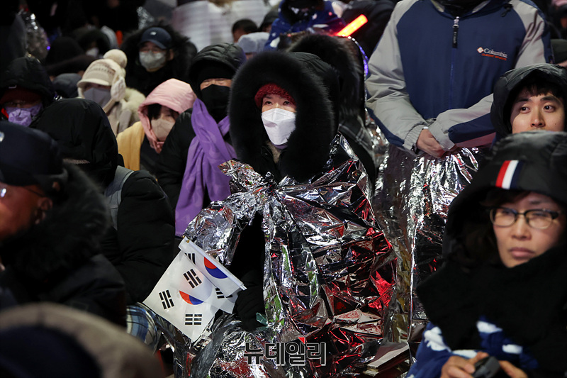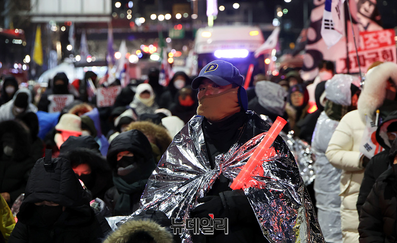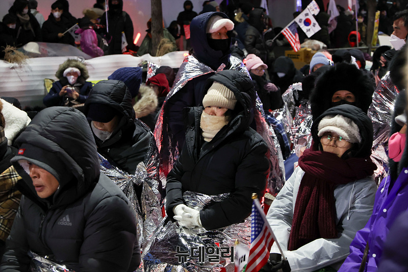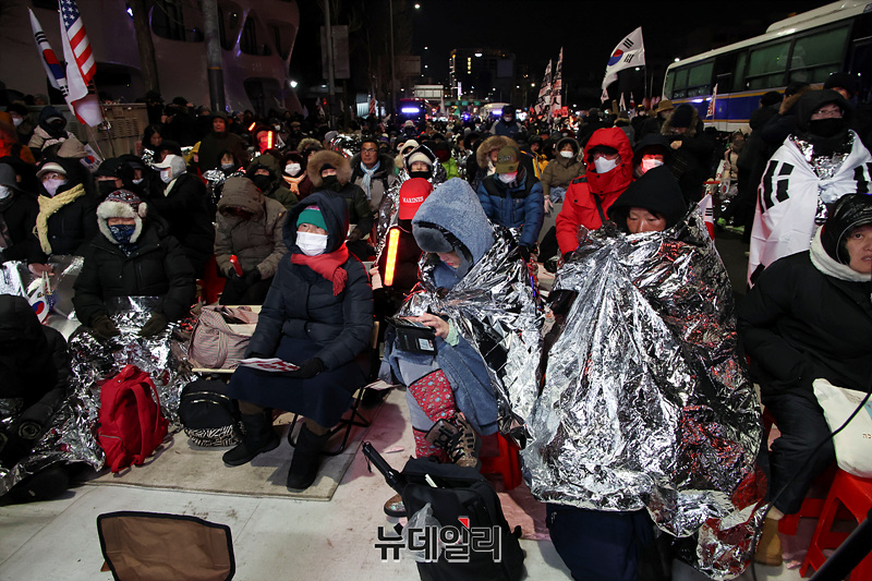 [포토] 은박담요 두르고 관저 지키는 尹 지지자들