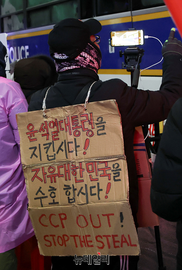윤석열 대통령에 대한 2차 체포영장 집행이 임박한 15일 오전 서울 용산구 한남동 대통령 관저 앞에 윤 대통령 지지자들이 자리를 지키고 있다.