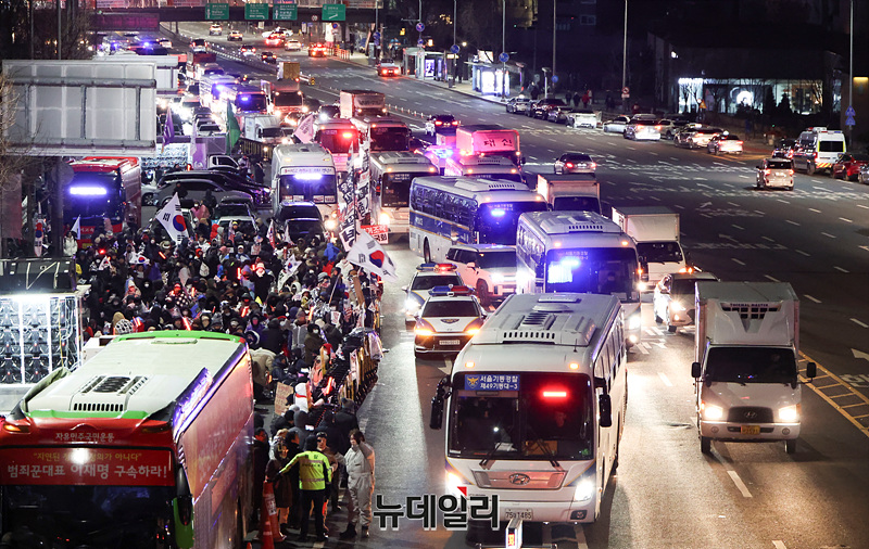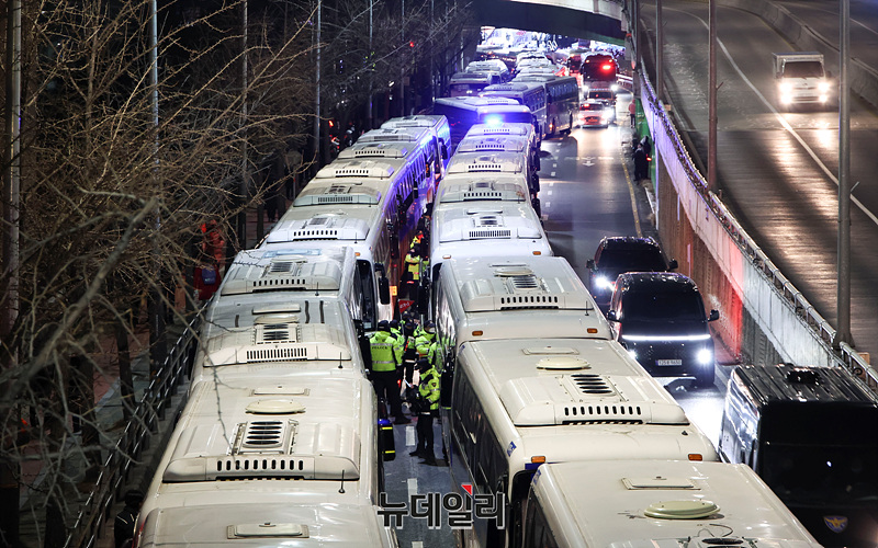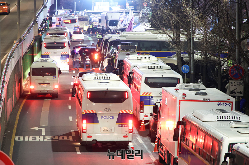 윤석열 대통령에 대한 2차 체포영장 집행이 임박한 15일 오전 서울 용산구 한남동 대통령 관저 앞에 경찰 기동대 버스가 줄지어 서 있다.
