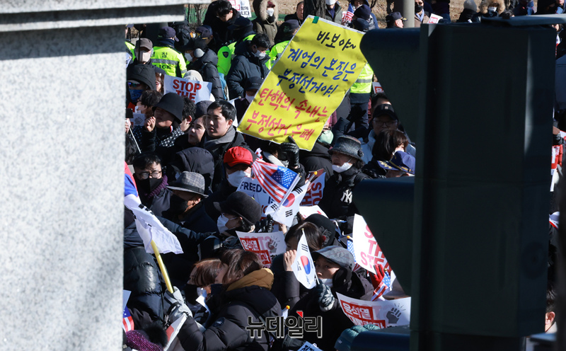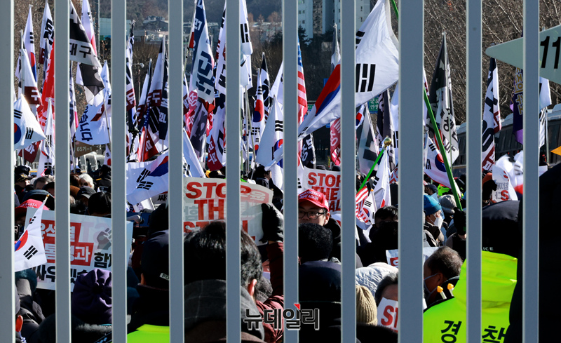 윤석열 대통령 지지자들이 15일 오후 경기 과천시 정부과천청사 앞에서 윤 대통령 지지·응원 집회를 하고 있다.