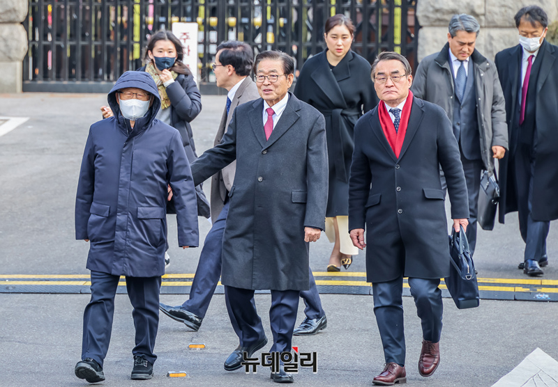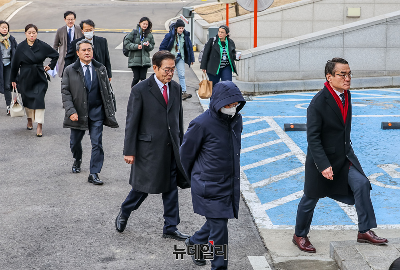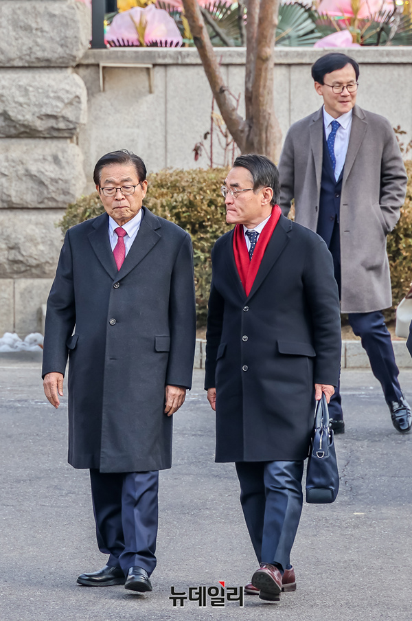 윤석열 대통령 탄핵심판 2차 변론기일이 열리는 16일 오후 서울 종로구 헌법재판소에서 윤 대통령측 변호인단인 정상명(가운데), 배보윤(오른쪽) 변호사 등이 심판정으로 향하고 있다.