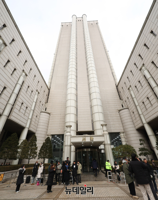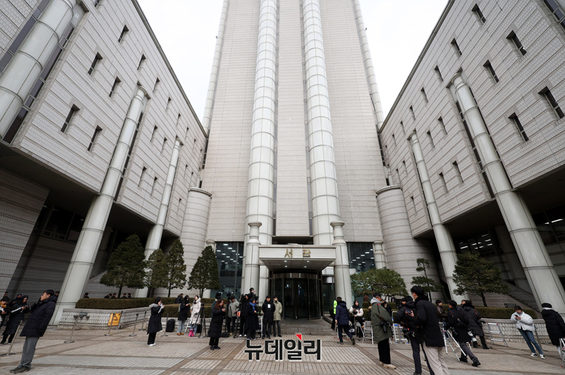 윤석열 대통령이 체포적부심사에 불출석한 16일 오후 서울 서초구 서울중앙지방법원에서 취재진이 대기하고 있다.