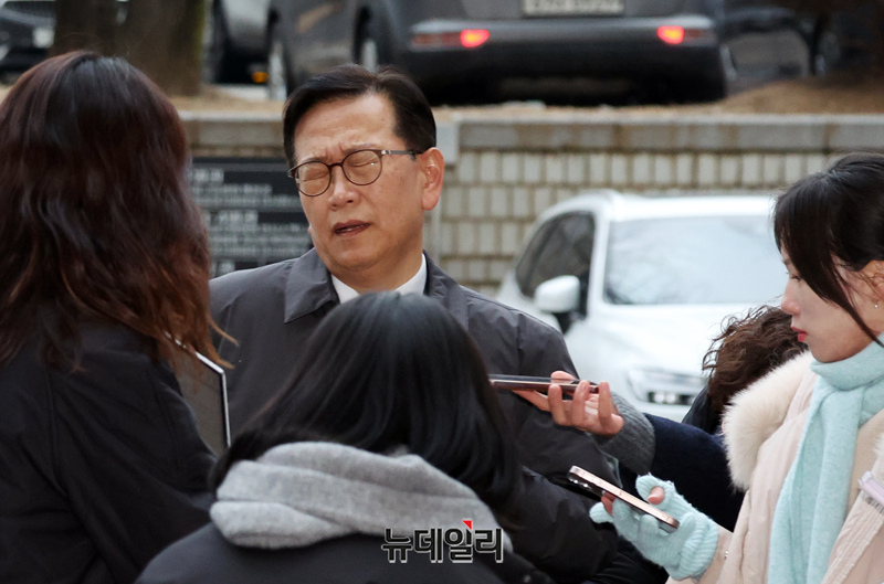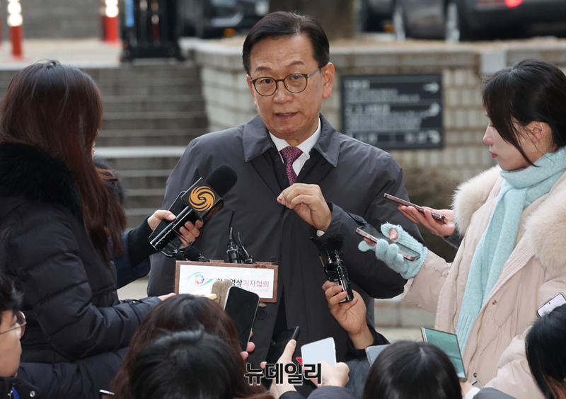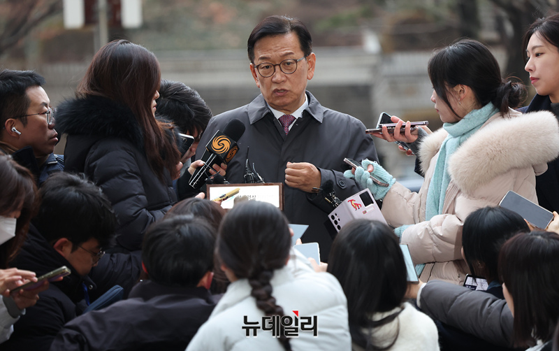 윤석열 대통령측 법률대리인 석동현 변호사가 16일 오후 서울 서초구 서울중앙지법에서 열린 윤 대통령 체포적부심사에 참석하기 전 기자들의 질문에 답하고 있다.