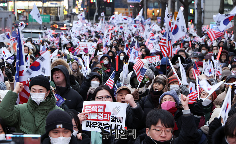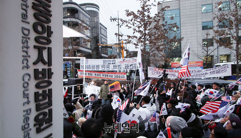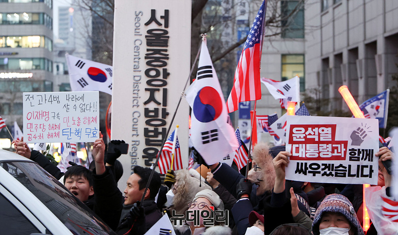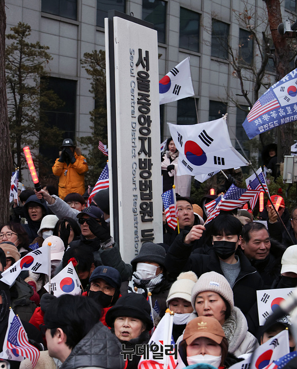 [포토] 체포적부심 진행중인 중앙지법 앞 집결한 尹 지지자들
