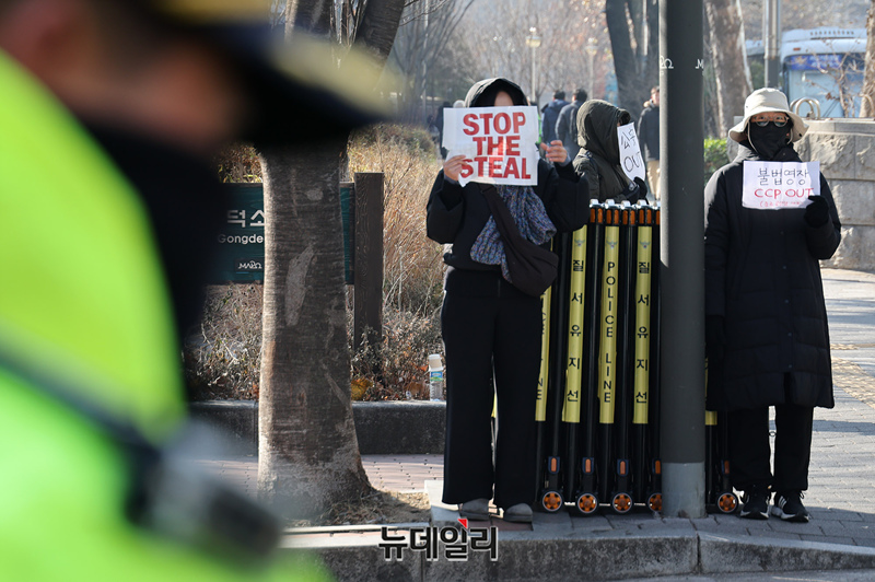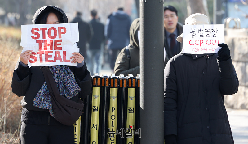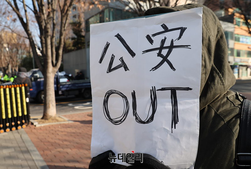 공수처가 윤석열 대통령 구속영장을 준비중인 17일 오전 서울 마포구 서울서부지법 인근에서 대통령 체포영장을 발부한 서부지법을 규탄하는 시민들이 1인 피켓 시위를 이어가고 있다.