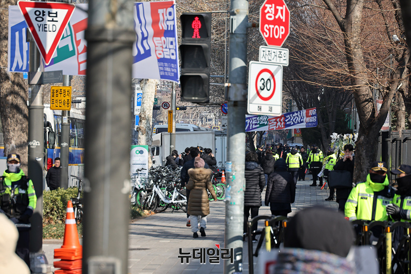 이날 오전 서부지법 입구에는 '법치주의 서부지법에서 사망하다' '자유민주주의와 헌법은 죽었다' 등의 조화가 놓이고 담장에는 '반국가 세력척결' 현수막이 붙었다. 지난밤 서부지법을 규탄하는 시민들이 대거 몰려 경찰과 충돌하기도 했다.