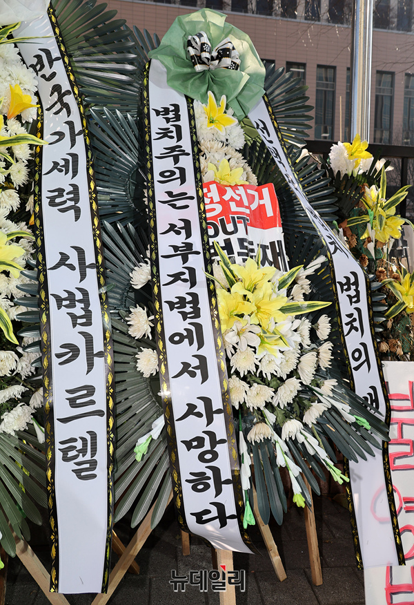 공수처가 윤석열 대통령 구속영장을 준비중인 17일 오전 서울 마포구 서울서부지법 입구에 대통령 체포영장을 발부한 서부지법을 규탄하며 시민들이 보낸 조화가 설치돼 있다. 조화에는 '법치주의 서부지법에서 사망하다' '자유민주주의와 헌법은 죽었다' 등의 메시지가 적혔다. 지난밤 서부지법을 규탄하는 시민들이 대거 몰려 경찰과 충돌하기도 했다.