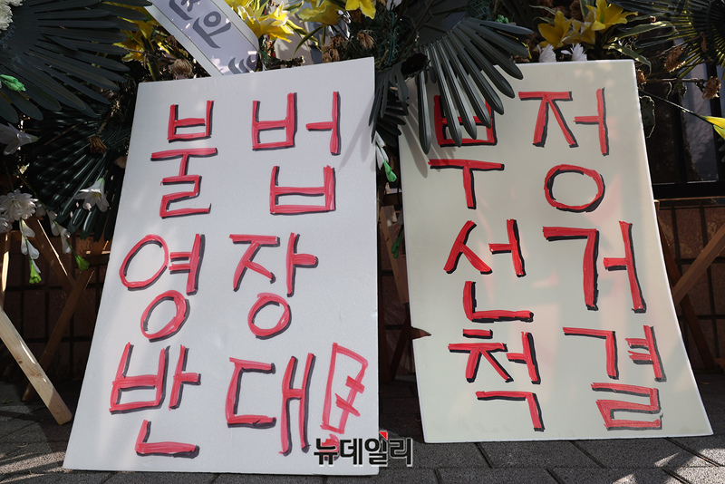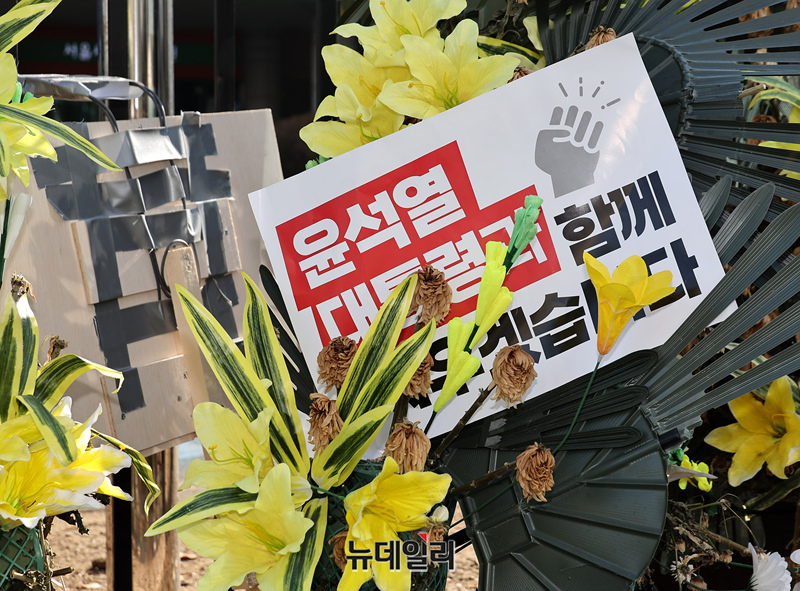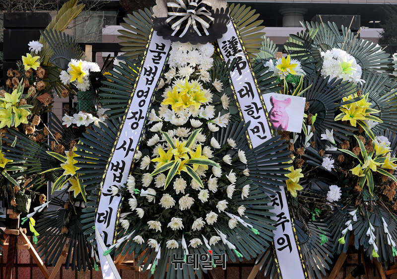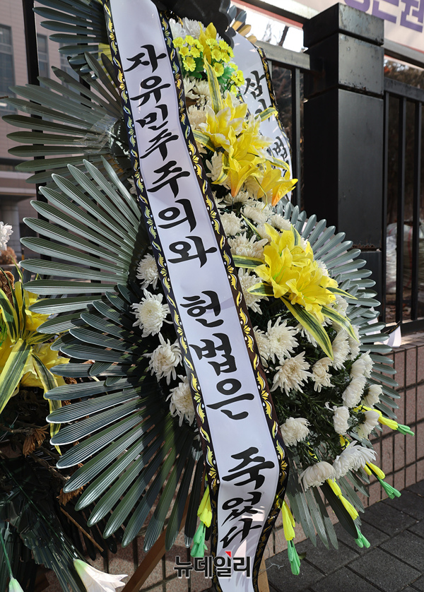 [포토] 체포영장 발부 서부지법에 놓인 조화 "법치주의 서부지법서 사망하다"