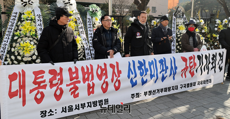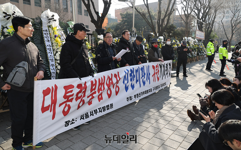 부정선거부패방지대(부방대) 구국별동대 자유와연대가 17일 오후 서울 마포구 서울서부지법 앞에서 윤석열 대통령 체포영장을 재발부한 신한미 판사를 규탄하는 기자회견을 갖고 있다.박윤성 부방대 사무총장은 "국가가 중대한 위기에 처해있고, 국가 시스템이 무너지며 불법이 일상화 되고 있는데 침묵할 수 없어 나왔다"고 기자회견 취지를 설명했다.서울서부지방법원에는 지난밤 대통령 체포영장에 반발하는 시민들이 대거 몰려 경찰과 충돌하며 밤샘집회를 이어갔다. 지법 앞에는 '법치주의 서부지법에서 사망하다' '자유민주주의와 헌법은 죽었다' 등의 조화가 놓이고 담장에는 '반국가 세력척결' 현수막이 붙었다.경찰은 공수처의 대통령 구속영장 신청을 앞두고 서부지법 앞에 경계를 강화하고 있다.