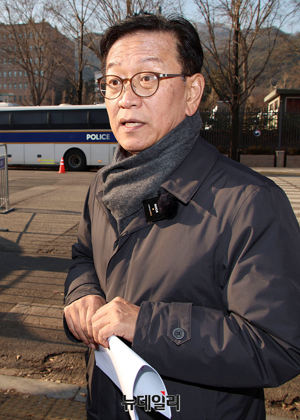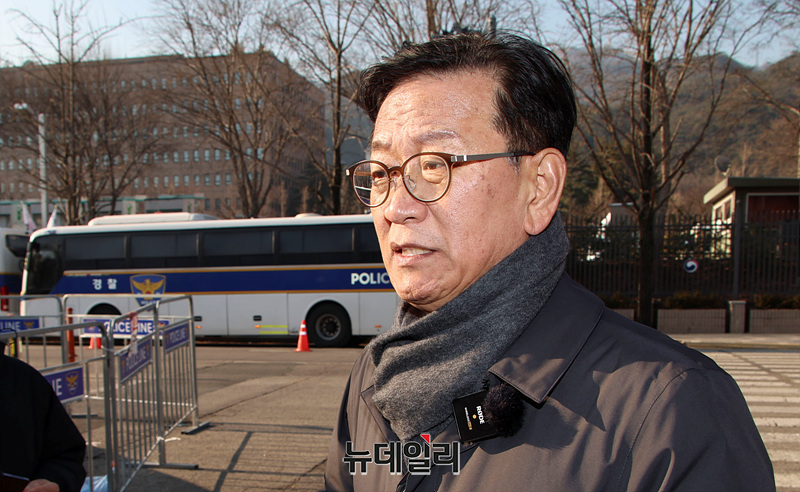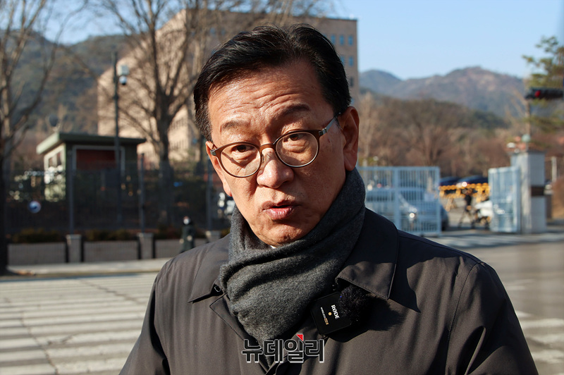 윤석열 대통령 접견을 마친 법률대리인 석동현 변호사가 17일 오후 경기 과천시 정부과천청사 앞에서 취재진의 질문에 답하고 있다. (경기 과천=서성진 기자)