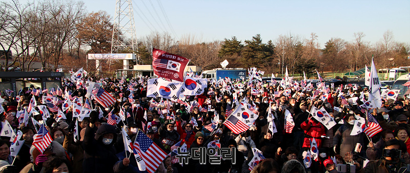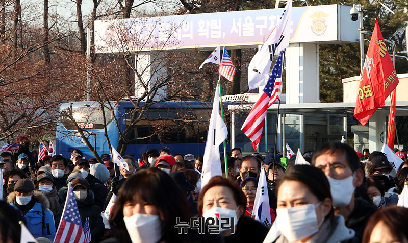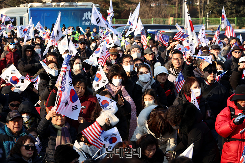 공수처가 윤석열 대통령 구속영장을 준비중인 가운데 17일 오후 경기 의왕시 서울구치소 앞에서 열린 윤 대통령 탄핵 반대 집회에서 지지자들이 태극기를 흔들고 있다. (경기 의왕=서성진 기자)