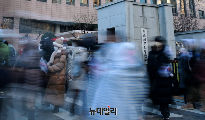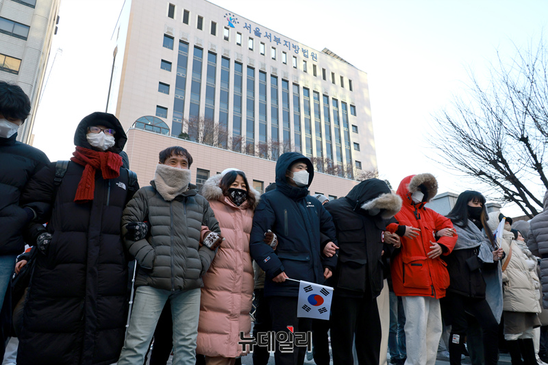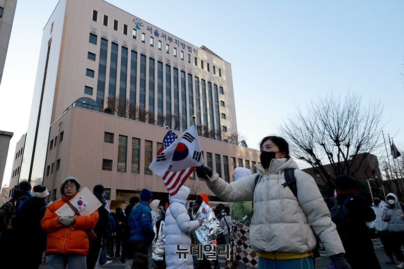 공수처가 윤석열 대통령 구속영장을 서부지법에 청구 가운데 18일 오전 서울 마포구 서울서부지법 인근에서 윤 대통령 지지 시민들이 집회를 하고 있다. 이들은 어제밤 부터 법원 앞에 모여 밤샘 연좌농성을 이어갔다. 윤 대통령에 대한 구속영장 심사는 오후 2시에 진행된다.