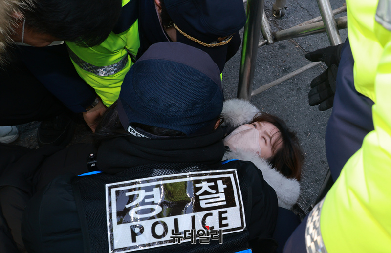공수처가 윤석열 대통령 구속영장을 서부지법에 청구 가운데 18일 오전 서울 마포구 서울서부지법 인근에서 윤 대통령 지지 시민들을 경찰이 강제해산 시키고 있다. 이들은 어제밤 부터 법원 앞에 모여 밤샘 연좌농성을 이어갔다. 윤 대통령에 대한 구속영장 심사는 오후 2시에 진행된다.