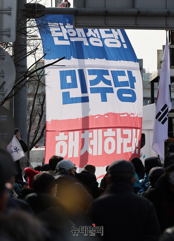 윤석열 대통령 탄핵을 반대하는 태극기 집회가 18일 오후 서울 중구 서울역 인근에서 진행되고 있다.