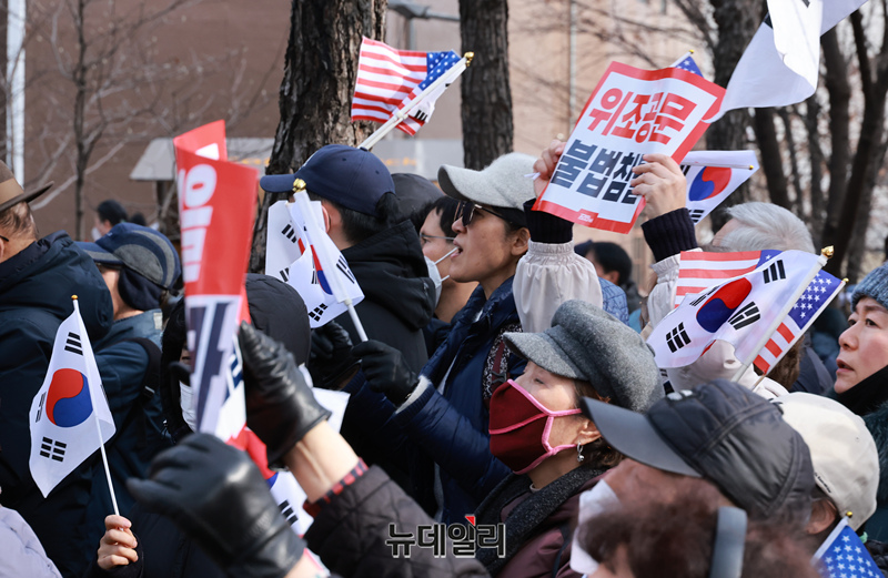 윤석열 대통령 구속영장심사가 진행중인 18일 오후 서울 마포구 서울서부지법 앞에 모인 시민들이 윤 대통령 지지집회를 하고 있다