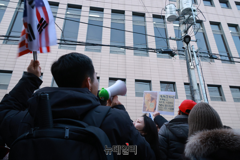 윤석열 대통령 구속영장심사가 진행 중인 18일 오후 서울 마포구 서울서부지법 앞에 대거 모인 시민들이 윤 대통령 지지 집회를 하고 있다. 현직 대통령이 영장실질심사에 출석하는 것은 헌정사에 처음 있는 일이다.