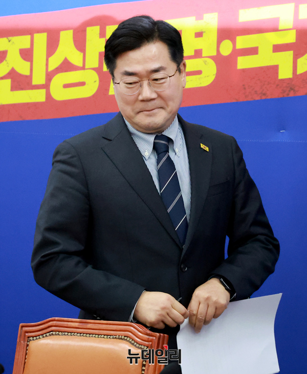 박찬대 더불어민주당 원내대표가 20일 오전 국회에서 열린 서부지법 폭동사태 관련 긴급 기자회견에 참석하며 인사를 하고 있다.