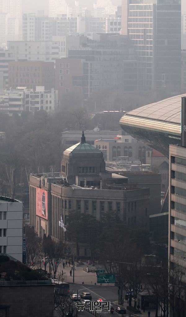 수도권에 초미세먼지(PM2.5)주의보가 내려진 20일 오후 서울도심이 미세먼지로 가시거리가 좋지않다. 이날 오전 9시 인천을 시작으로 정오에는 서울지역에 초미세먼지주의보가 발령됐다.