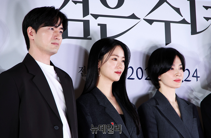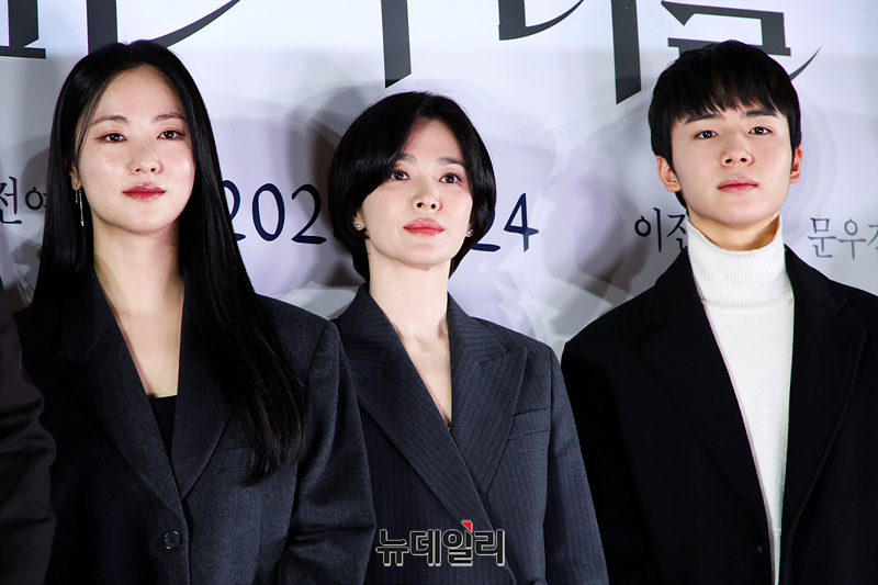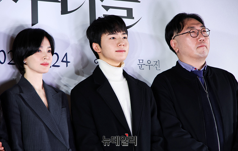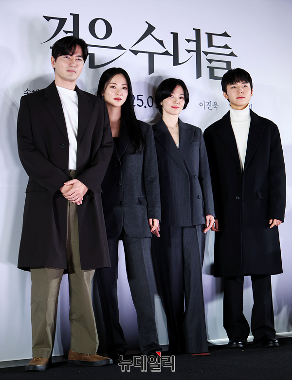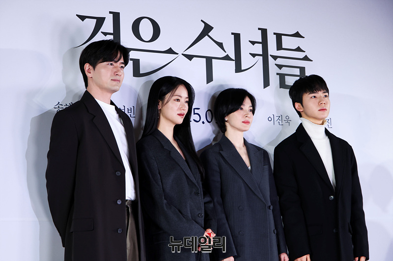 배우 송혜교, 전여빈, 이진욱, 문우진이 20일 오후 서울 강남구 메가박스 코엑스점에서 열린 영화 '검은 수녀들' 언론시사회 및 기자간담회에서 포즈를 취하고 있다.