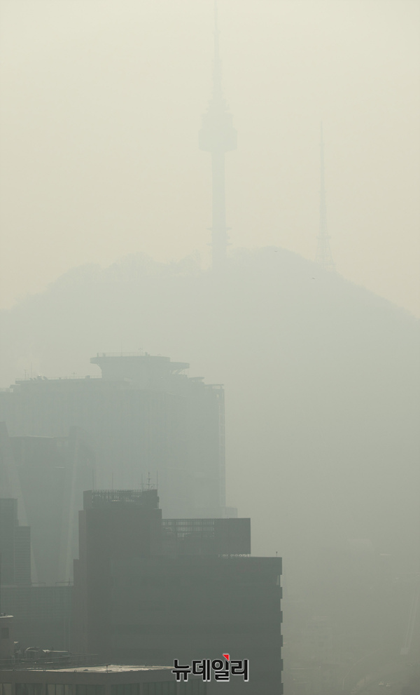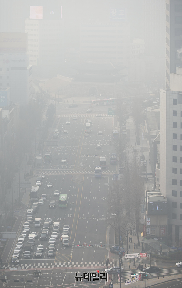 수도권에 초미세먼지 주의보가 내린 21일 오전 서울 숭례문이 미세먼지와 안개로 뿌옇게 보이고 있다.