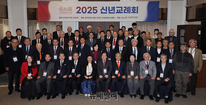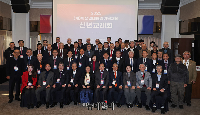김황식 이승만대통령기념재단 이사장을 비롯한 참석자들이 21일 오전 서울 중구 한국프레스센터에서 열린 2025 이승만대통령기념재단 신년교례회에서 기념촬영을 하고 있다.