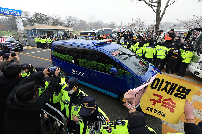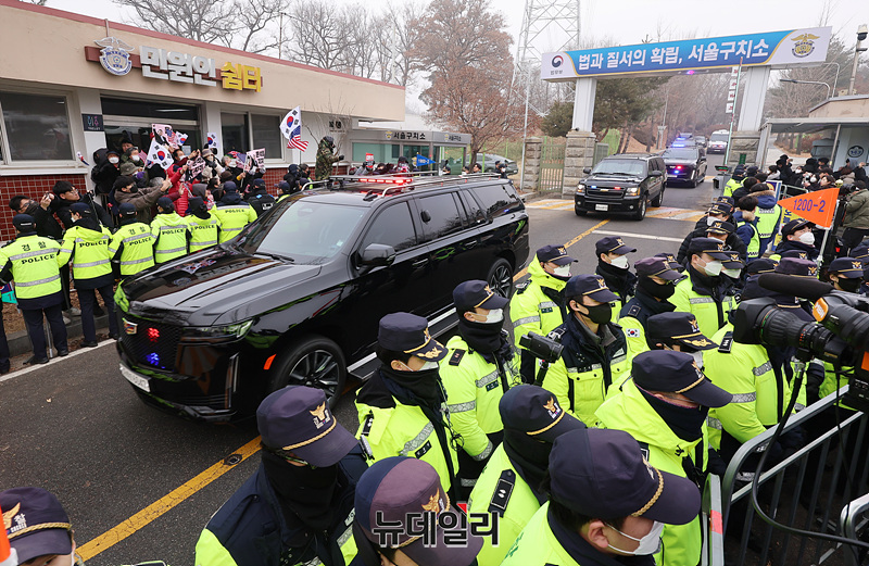 윤석열 대통령이 탄 법무부 호송차량이 대통령경호처 호송을 받으며 21일 오후 경기도 의왕시 서울구치소에서 헌법재판소로 이동하고 있다.